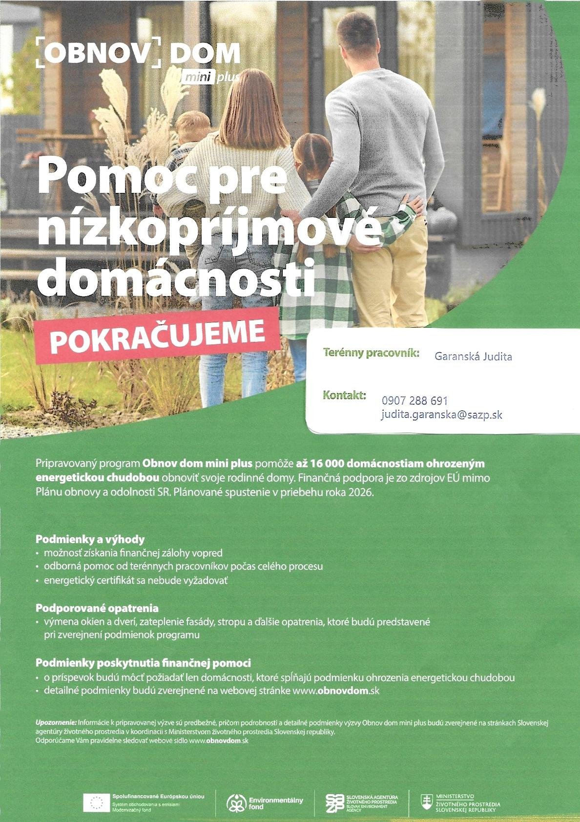 Viac informácií nájdete na stránke www.obnovdom.sk ,alebo si dohodnite bezplatnú konzultáciu s terénnym pracovníkom SAŽP- Judita GaranskáTel.: 0907 288 691 Email: judita.garanska@sazp.sk